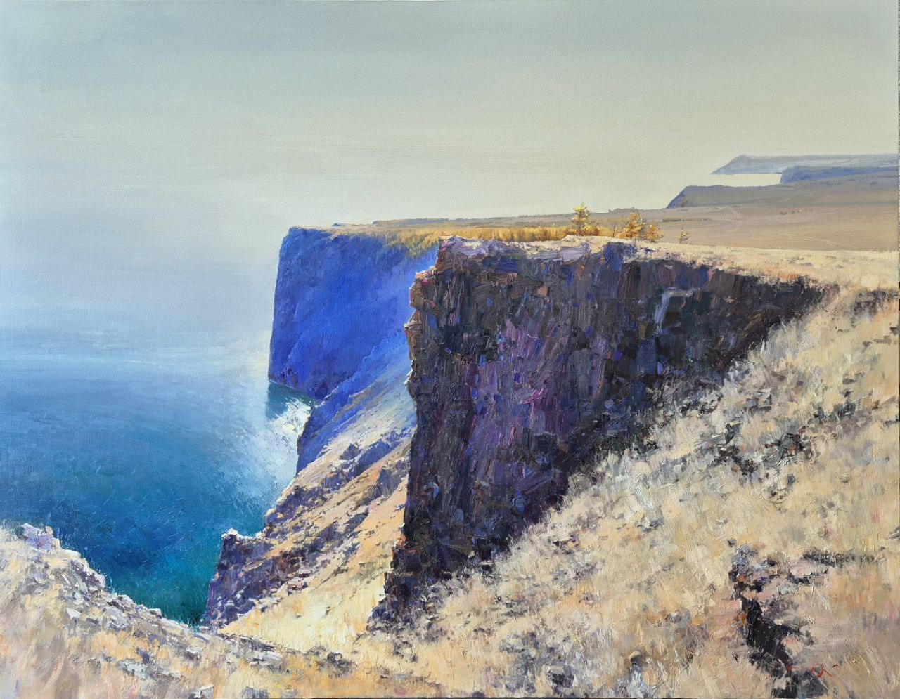 На полотне — идеально гладкая вода Байкала в утренней дымке. .