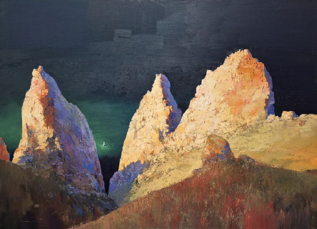 «Три брата» (год, х.м., 135х178) Величественные скалы-исполины "Три Брата" на мысе Бурхан, застывшие в вечном страже у ворот открытого Байкала, где ветер времени рассказывает древние легенды, а маленький кораблик у их подножия позволяет ощутить грандиозность мироздания.