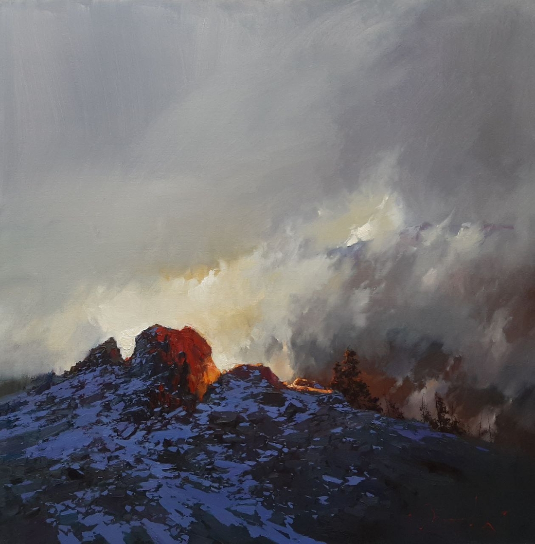 «В сердце гор» (2024, х.м., 100х100) Эта картина родилась из того утра, когда, стоя в сердце густого тумана, я увидел, как упрямый луч света прорвался сквозь молочную пелену, открыв мне не просто рождение нового дня, а саму душу гор — и в этом мгновении я понял, что свет всегда найдёт дорогу, даже сквозь самую плотную тьму.