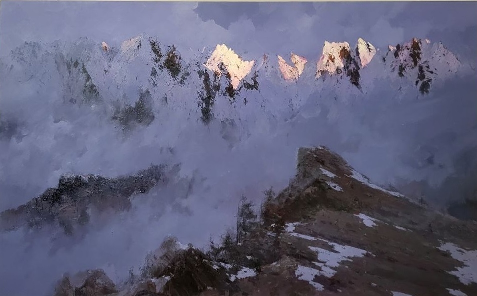 «Пробуждение» (2022, х.м., 140х210) Это застывшее на холсте мгновение тишины между туманом и светом, когда внезапно открывающиеся снежные пики дарят путнику ощущение, будто сама вечность на миг приоткрыла ему свои объятия.